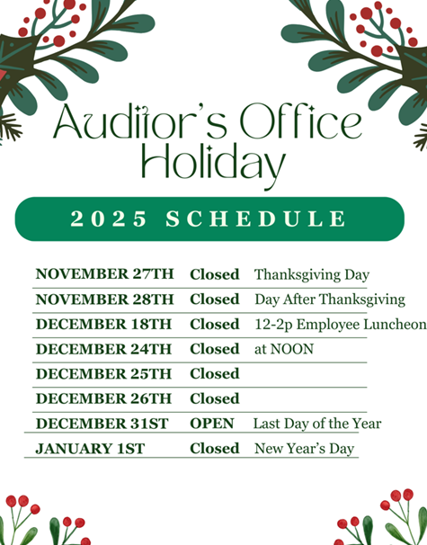 Event date: 11/7/2025 - 1/3/2026 Export event Tara Frable / Friday, November 7, 2025 / Categories: Announcements, Events Auditor Holiday Schedule The Auditor's Office will be closed the following days for the holidays: Previous Article Property Tax Reform - Auditor’s Association Press Conference Print 1654